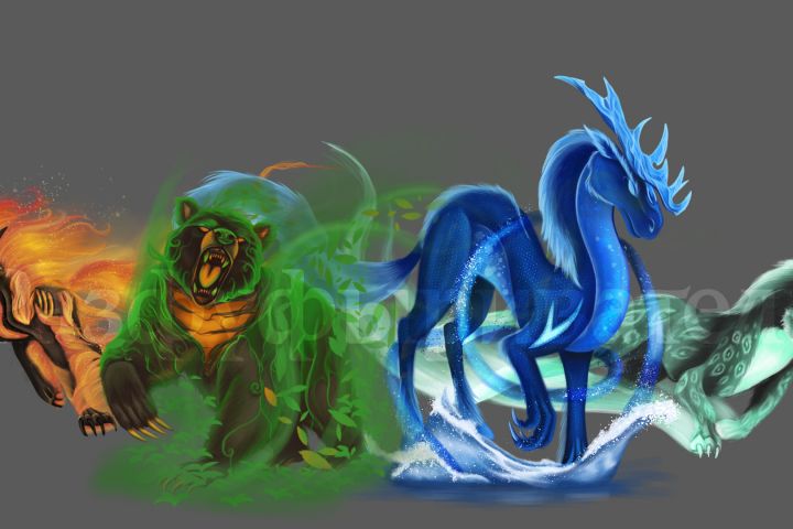 Четыре элементаля- огонь,земля,вода и воздух. Выполнены в виде животных.