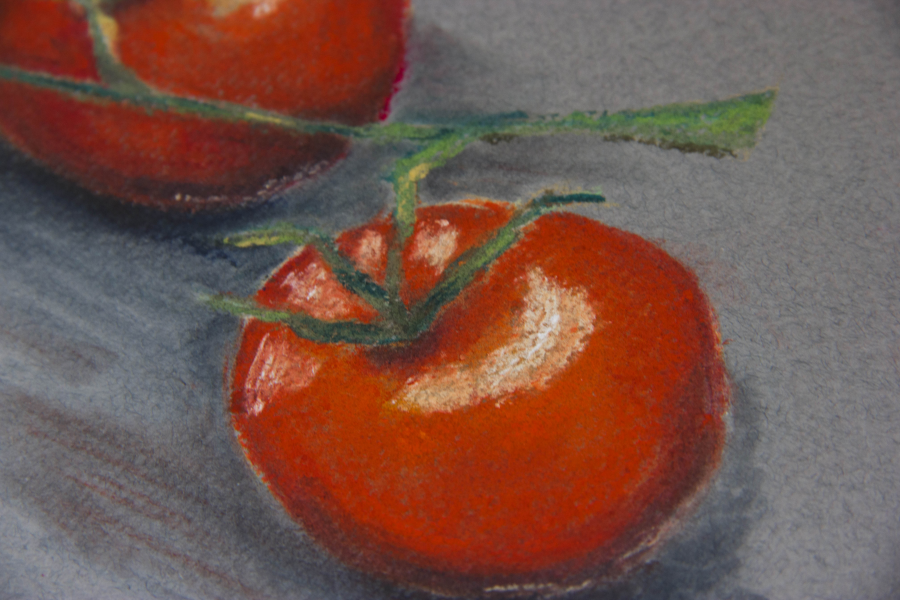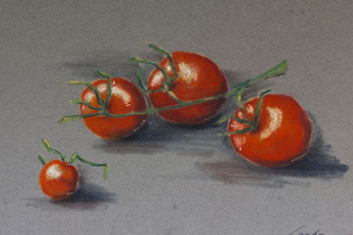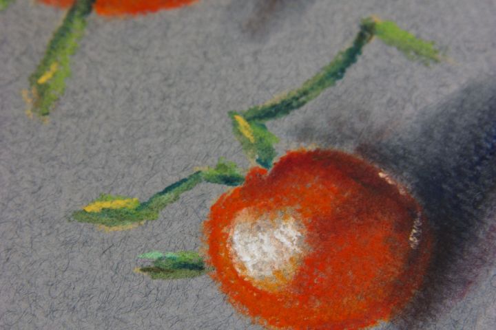 Минималистичное изображение веточки помидорок черри, выполненное сухой пастелью Mungyo на бумаге плотностью 160 гр/м. Формат А4. Работа покрыта фиксативом.