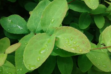 Листья кустарника после дождя крупным планом. Снято на камеру смартфона.