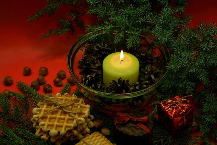 Зажжённая свеча,ветка можжевельника,печенье,подарок,орехи-крупным планом на декоративном фоне.