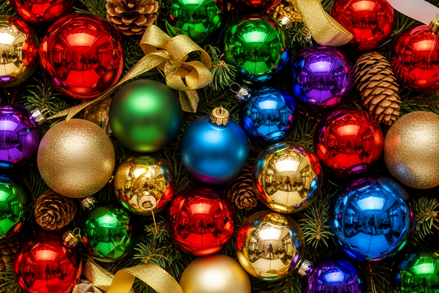 Красочный новогодний натюрморт, заполненный блестящими ёлочными шарами разных цветов — красными, золотыми, зелёными, синими и фиолетовыми. Создан нейросетью. Между игрушками лежат шишки, еловые ветви и сверкающие ленты, создавая эффект богатого праздничного декора. Изображение передаёт атмосферу подготовки к празднику, тепла и яркого новогоднего настроения. Идеально подходит для праздничных баннеров, открыток, упаковки и сезонного контента