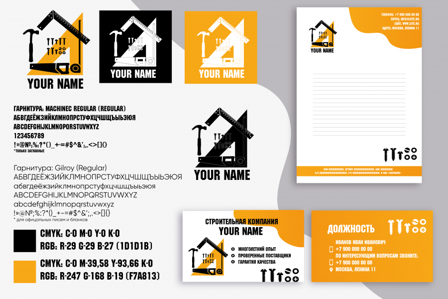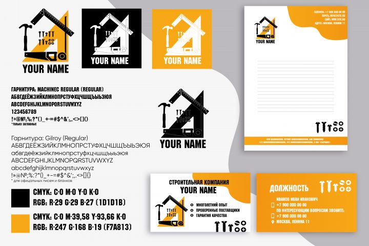 В знаке скомпонованы силуэты строительных инструментов: молоток, угольник, пила, рулетка, болты, шурупы, гвозди. Логотип можно использовать для компании связанной с городской инфраструктурой, строительством домов, городских объектов, возможно использование в других сферах деятельности. В логотипе используется бесплатная гарнитура для скачивания. В комплект к логотипу идёт бланк и визитка
