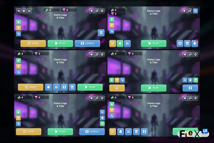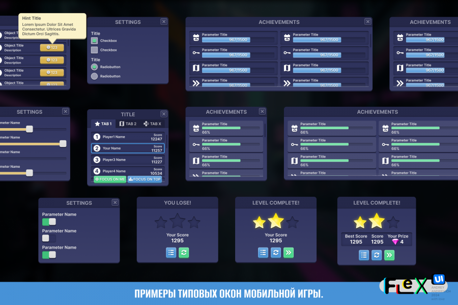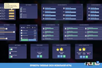 Уже готовый UI Kit (набор элементов интерфейса) для вашей игры с примерами основных окон типичной мобильной игры (БОЛЕЕ 70 примеров).