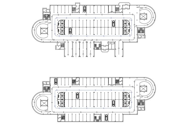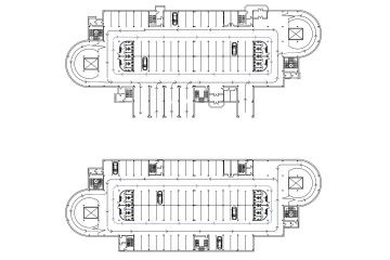 Курсовой проект надземного 2 этажного паркинга. Включает в себя DWG файл с планами, разрезами и фасадами. Проект является учебным (эскизным).