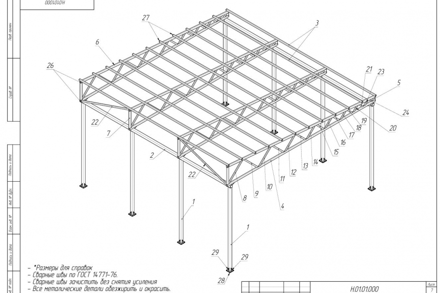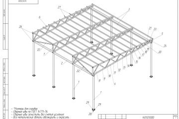 Проект односкатного навеса на две машины, отлично впишется на вашем загородном участке. Навес рассчитан на четвертый снеговой район. Раскрои листовых деталей в комплекте.