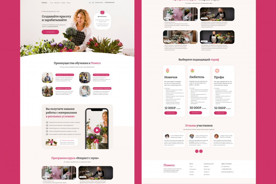 Идеально подойдет для продажи курсов. Изначально делался для продажи курсов по флористике (учебный проект, этот дизайн нигде не использовался)