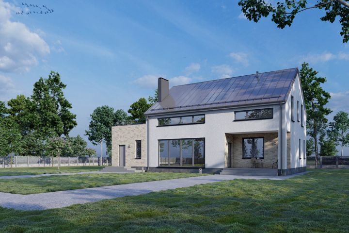 Двускатная крыша, второй свет, 3 спальни, гараж в тепловом контуре. Материал стен: Твинблок.