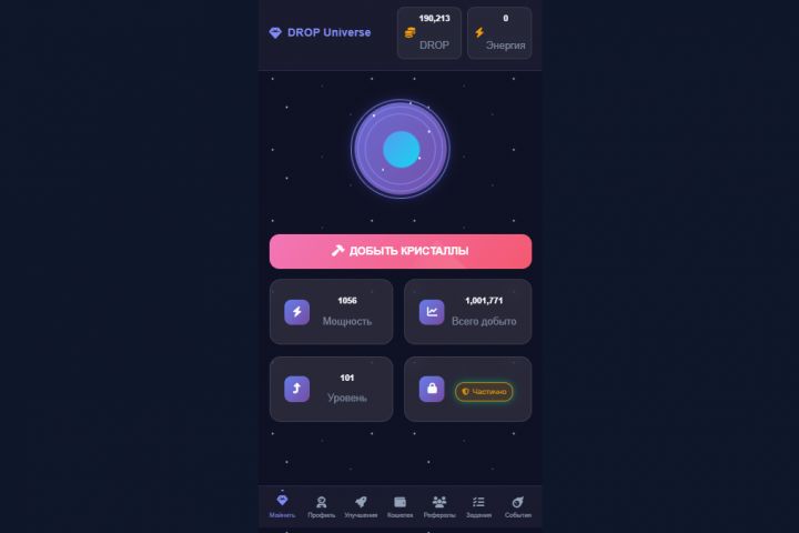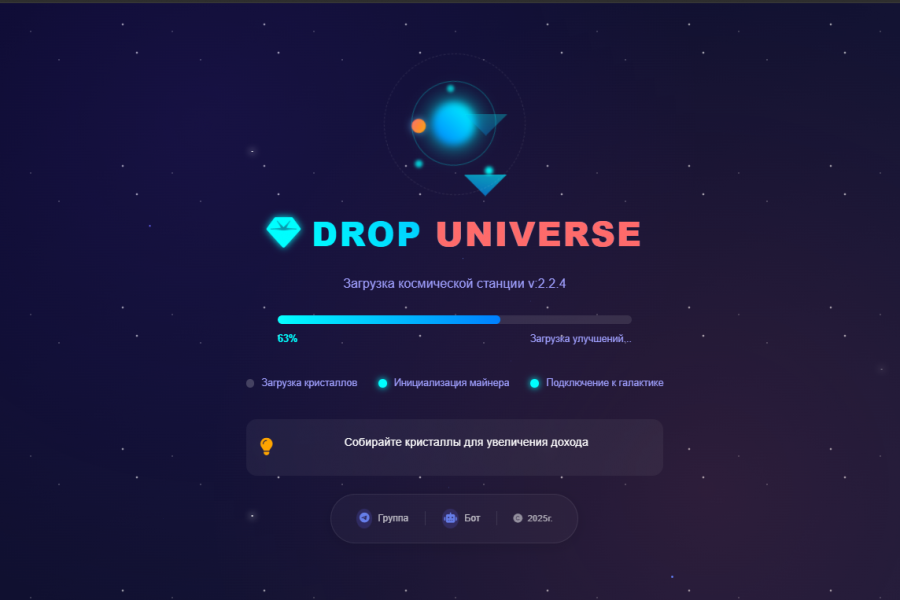Готовый к запуску скрипт Telegram-игры «DROP Universe» (кликер с майнингом ресурсов). Полностью рабочий продукт с исходным кодом.