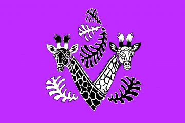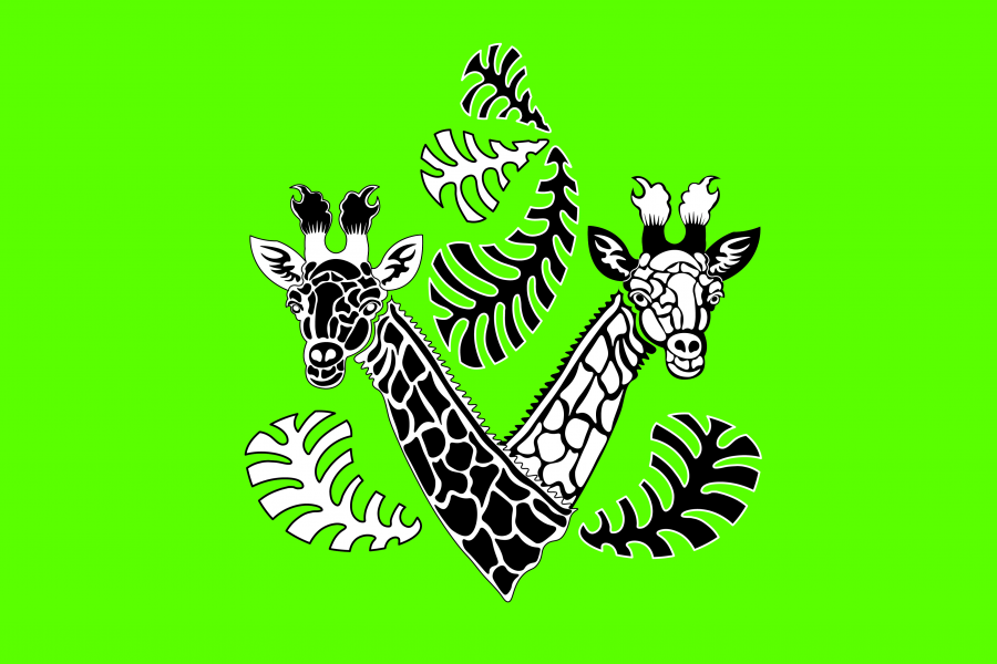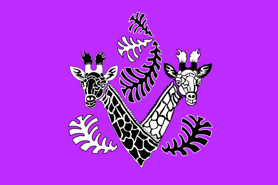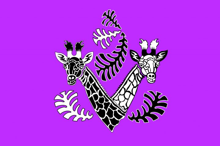 Пара красивых жирафов, черно белый векторный рисунок на цветном фоне, который можно использовать в качестве открытки, обложки, иллюстрации и т.д.