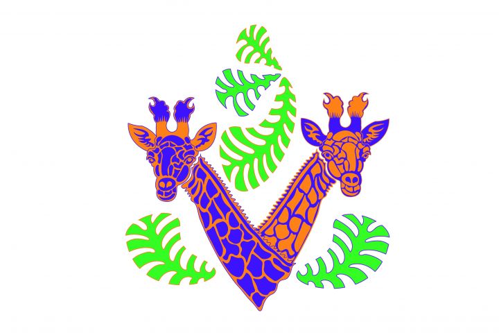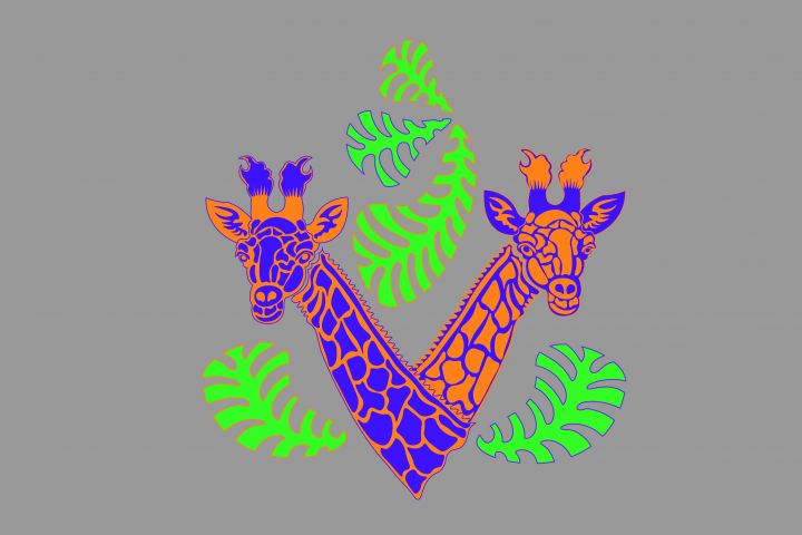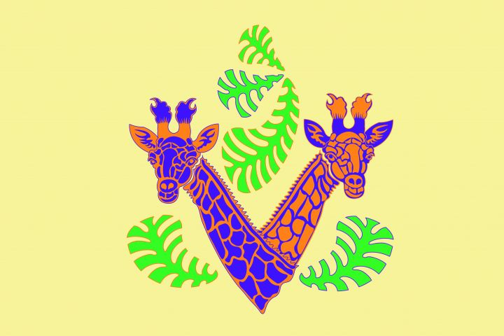 Пара жирафов на фоне дикорастущих лиан, цветное векторное изображение которое можно использовать как иллюстрацию, обложку, открытку и т.д..