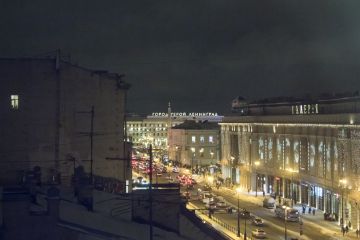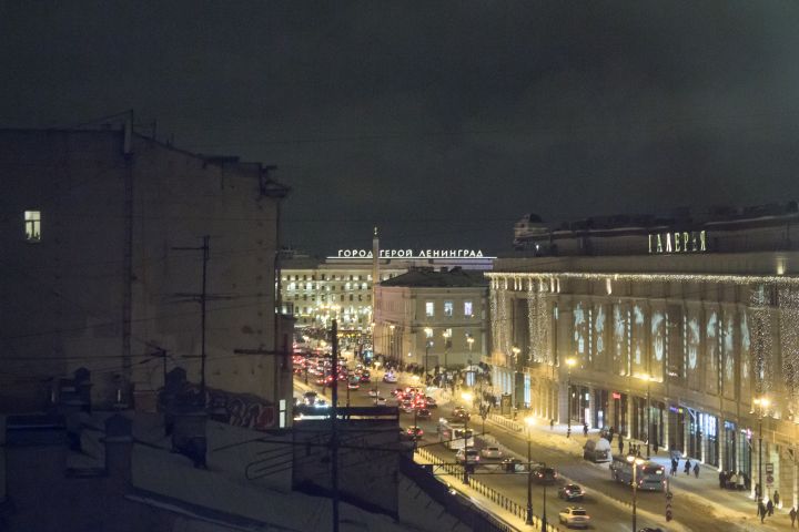 Ночью автомобили и автобусы едут по Лиговскому проспекту в Санкт-Петербурге, образовалась небольшая пробка.