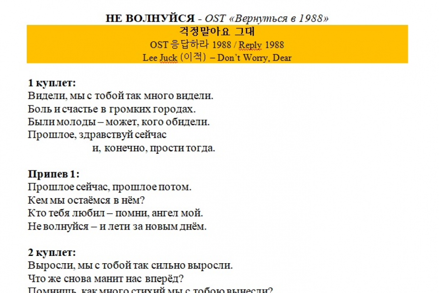 Русский текст песни из корейской дорамы "Вернуться в 1988". На прикреплённой картинке представлен фрагмент русской версии. При переводе сохранены: атмосфера песни и фонетическое сходство с оригиналом.