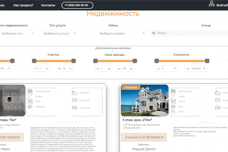 Сайт для агентства недвижимости, с возможностью продажи/сдачи в аренду. Авторизация на PHP+JS, админ-панель PHP+JS, каталог товаров с множеством фильтров для удобного поиска, блоки с информацией, отдельные динамические страницы каждого объекта недвижимости, возможность клиентом редактировать цены на оставленную им недвижимость (до момента принятия недвижимости). Если что-то не рассказал, все в лс :)