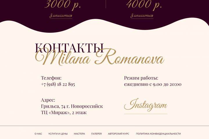 Включает блоки с информацией о салоне, услугах, мастерах, авторском курсе и другое.