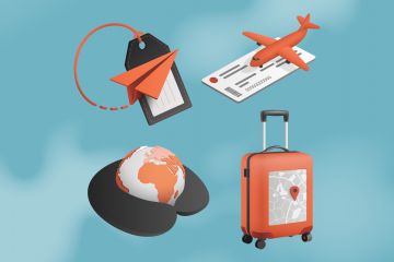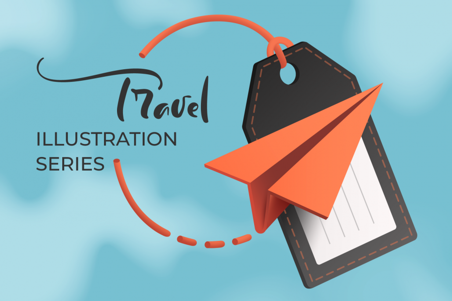 В серию входит 4 иллюстрации: бумажная бирка + бумажный самолет, земной шар + подушка для путешествий, чемодан + карта, посадочный талон + самолет.