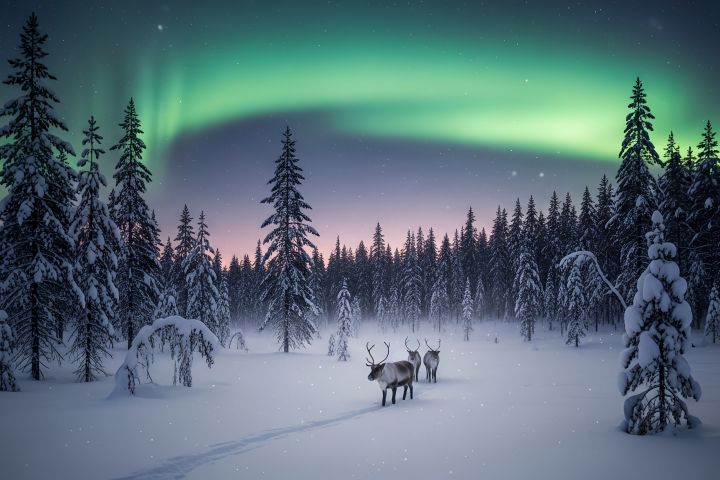 Завораживающий зимний пейзаж, созданный нейросетью: под сиянием северного сияния по заснеженному лесу идут олени. Высокие ели, мягкий свет на горизонте и тишина морозного вечера создают атмосферу северной сказки и спокойствия. Идеально для зимних обложек, открыток, туристического и атмосферного контента