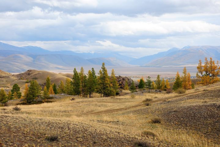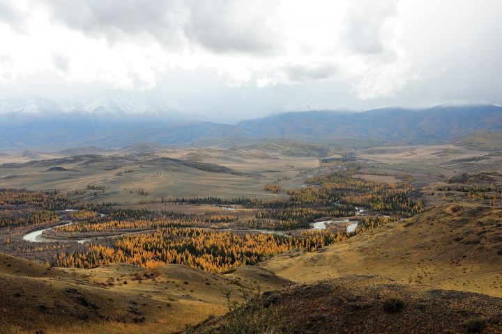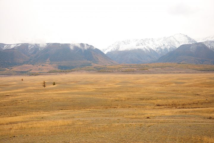 Панорамный снимок Чуйской степи и Северо-Чуйского хребта в конце сентября, Горный Алтай.