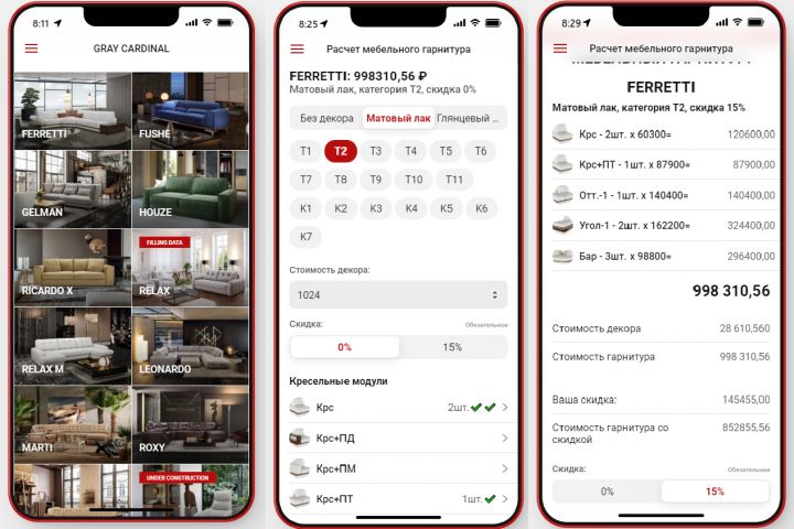 Реализован выбор коллекции; выбор вариантов декора; ценовой категории тканей; доступных для данной коллекции скидок; выбор модулей мягкой мебели.