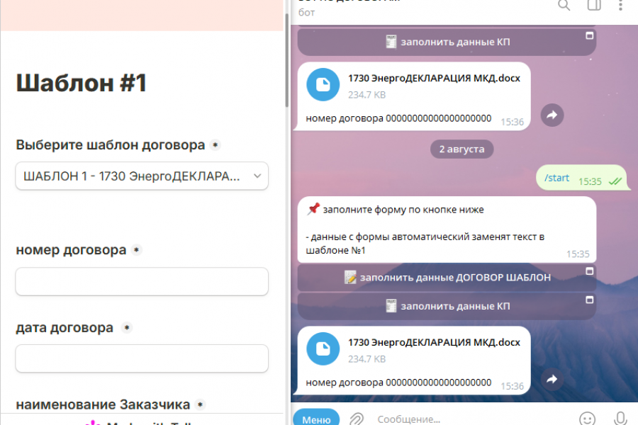 — Использовать заранее подготовленный шаблон Google Docs с плейсхолдерами (например, {{ФИО}}, {{дата}}, {{договор_номер}} и другие).