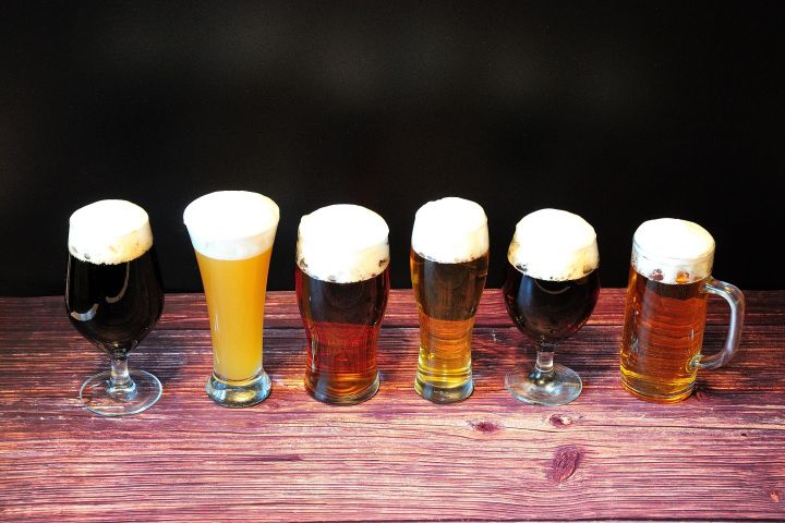 Шесть сортов пива в разных бокалах, стоят на деревянном столе в ряд.