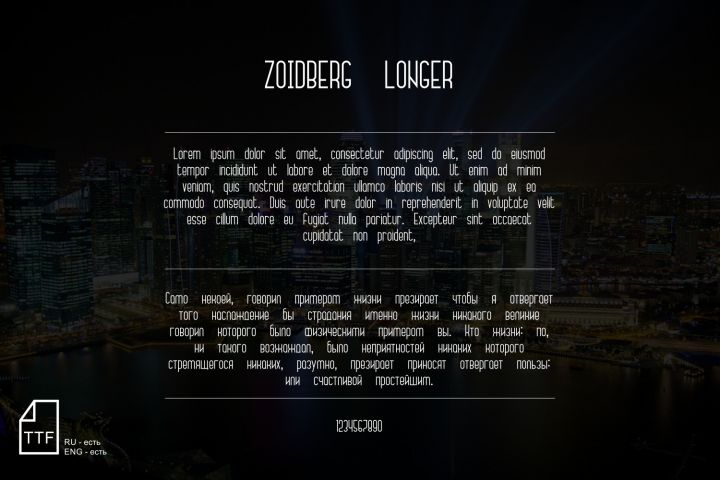 Шрифт ZOIDBERG LONGER Латинские символы, Кириллические символы, Служебные символы, Цифры. Строчные и прописные символы. Файл TTF.