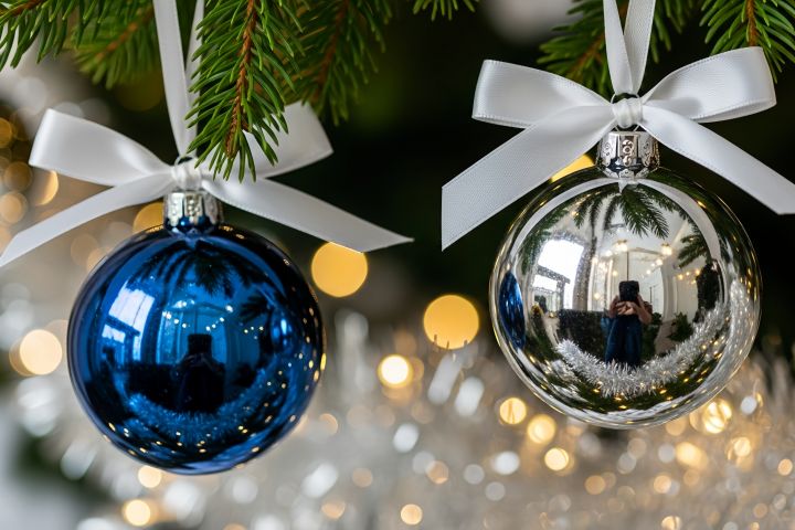 Крупный план двух праздничных елочных шаров изящных холодных оттенков — глубокого сапфирового синего и мерцающего серебра. Создано нейросетью. Шары подвешены на пушистых ветвях ели с помощью элегантных белых лент, завязанных в нежные бантики. На заднем плане, создавая волшебную атмосферу, мягко размываются золотистые блики и блёстки. Идеальная концепция для праздничного дизайна, передающая ощущение зимней сказки, чистоты и стильного украшения.