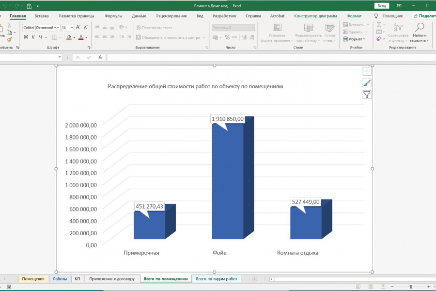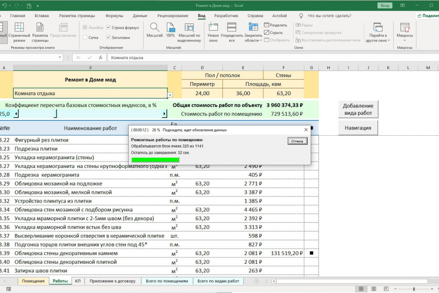 Приложение на Excel для расчёта стоимости всех видов отделочных работ с учетом размеров помещений и расценок из прайсов сметных работ.