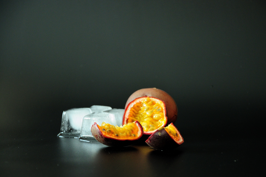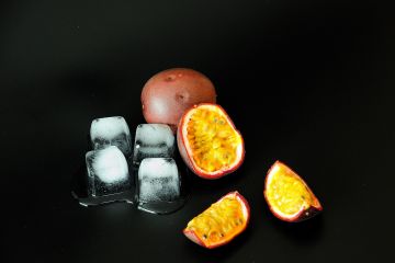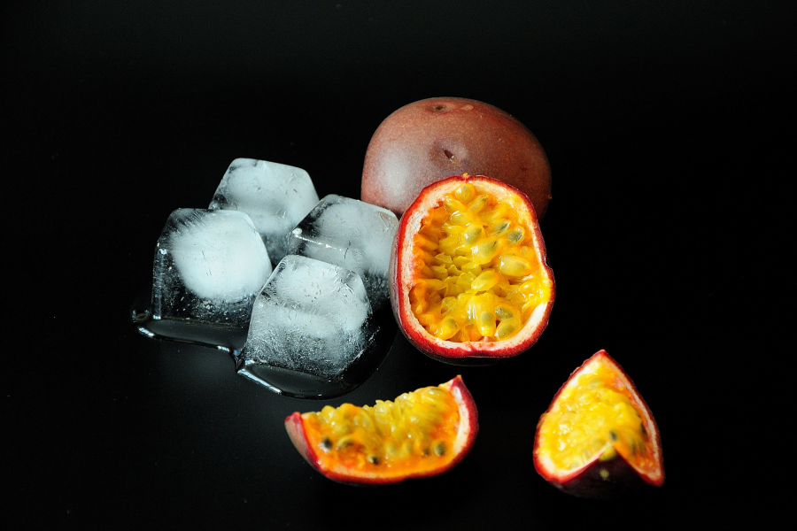 Спелый экзотический фрукт маракуйя резаный на кусочки и кубики подтаявшего льда на чёрном фоне.