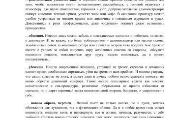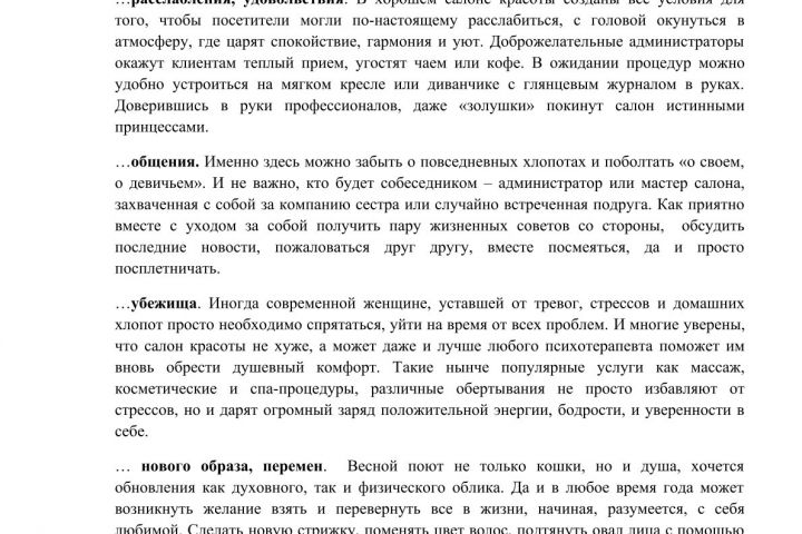В статье приводятся аргументы в пользу регулярного посещения салонов красоты. Рассказ о том, что еще, кроме услуг, можно получить в салоне, студии красоты. Текст 100 % уникальности.