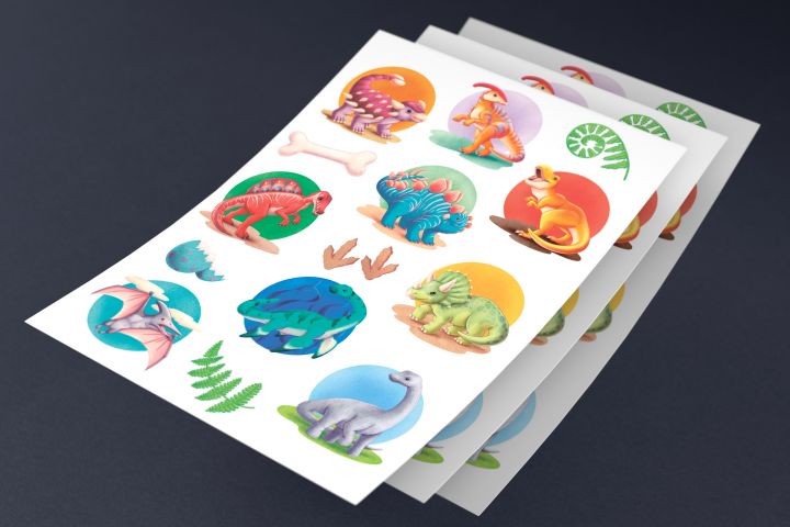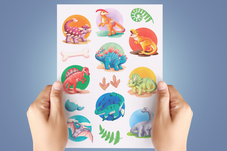 Стикерпак формата А5 (размер 148х210мм), включающий в себя 14 наклеек, в том числе изображения 9 самых популярных динозавров: Тиранозавр, Диплодок, Трицератопс, Птерозавр, Стегозавр, Анкилозавр, Спинозавр, Плезиозавр, Паразауролоф.