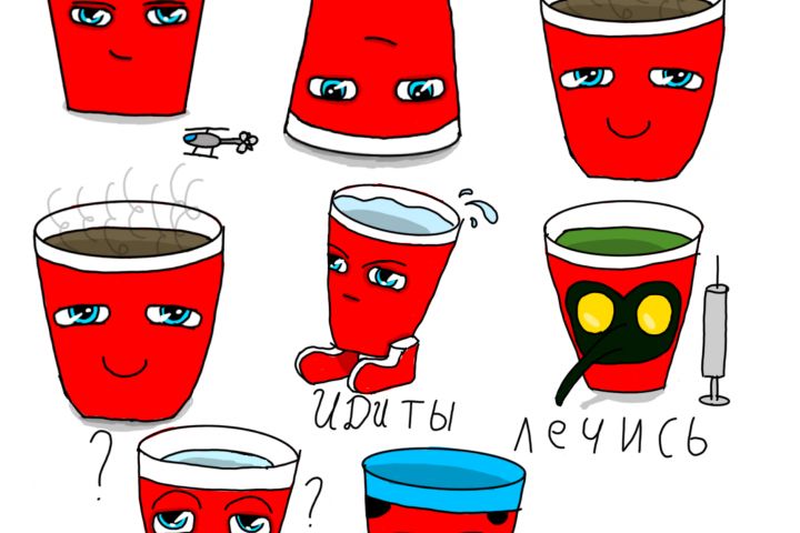 Здравствуйте, Я иллюстратор стикеров. Вот одна из работ на тематику, Что есть стаканы живые. Пишите в (telegram-Makim17)
