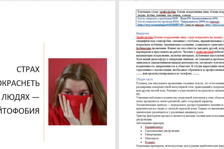Статья содержит подзаголовки: введение, общая часть, причины, симптомы, лечение и заключение. Кол-во символов без пробелов:8134 Уникальность 100% по текст.ру - зафиксирована, Вода:9% Заспамленность:44%