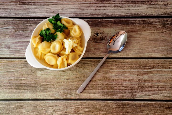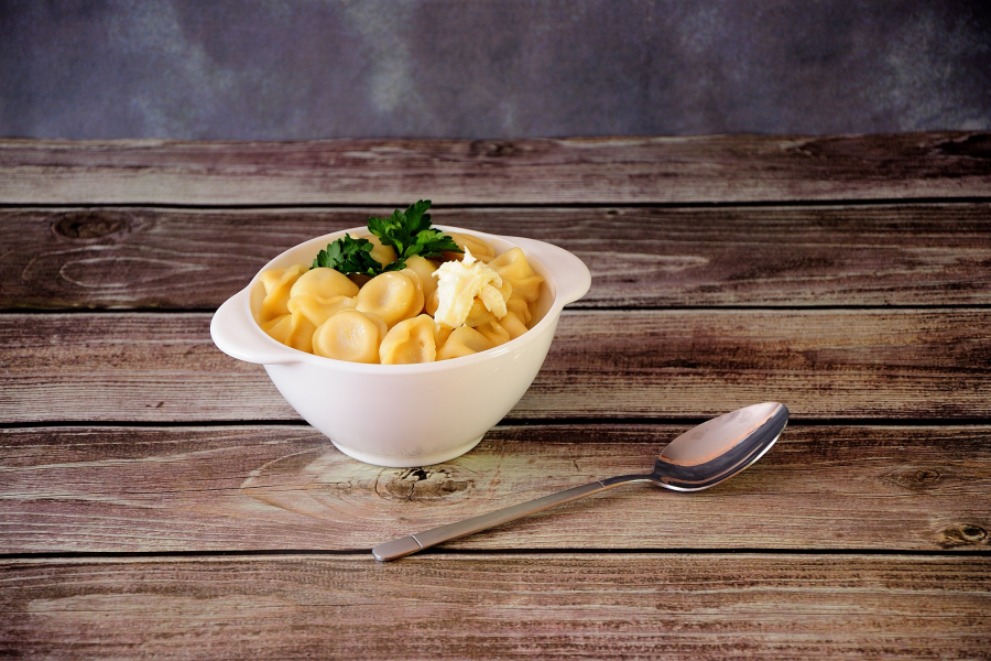 Тарелка свежесваренных пельменей.