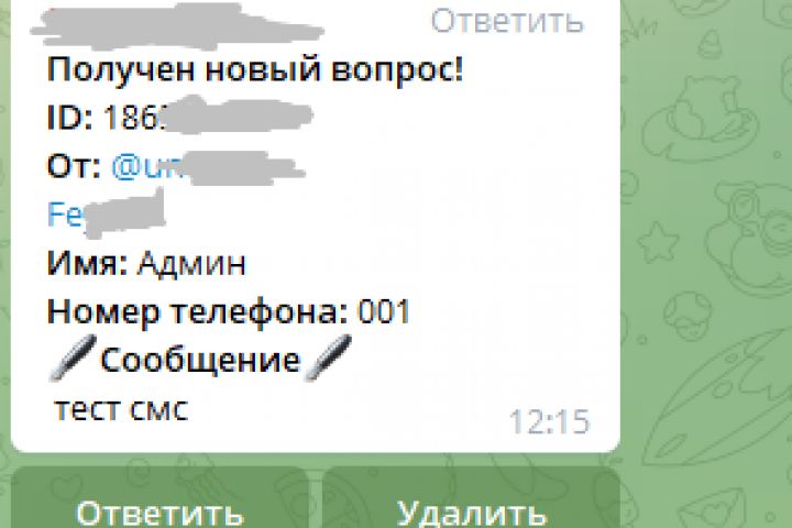 3. Из админ чата можно ответить пользователю в личные сообщения, а так же удалить заявку.
