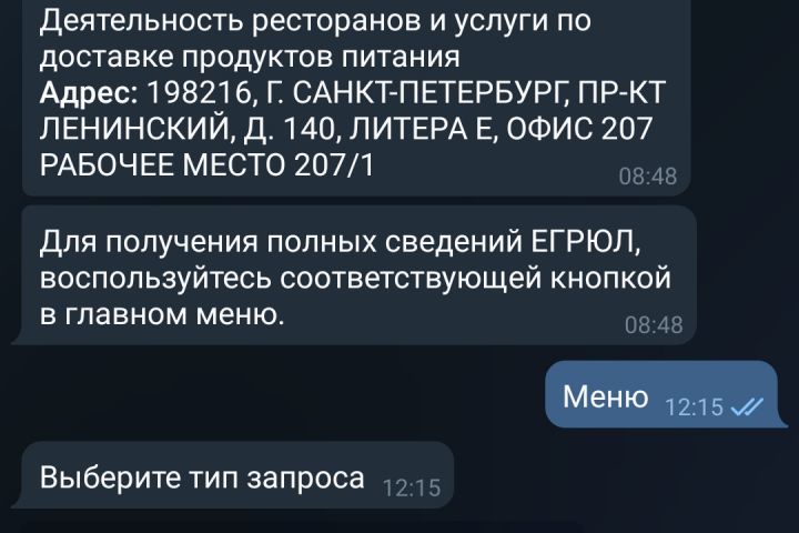 Бот по предоставлению выписок ЕГРЮЛ. Даёт список организаций по текстовому поиску, формируя кнопки с названием. По нажатию выходит краткое описание, при вводе инн даёт выписку в пдф с базы налог.ру.