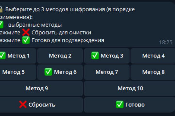 Многоуровневое шифрование: Возможность выбора от 1 до 3 методов шифрования из 10 доступных.