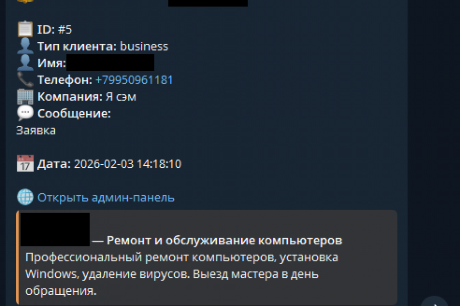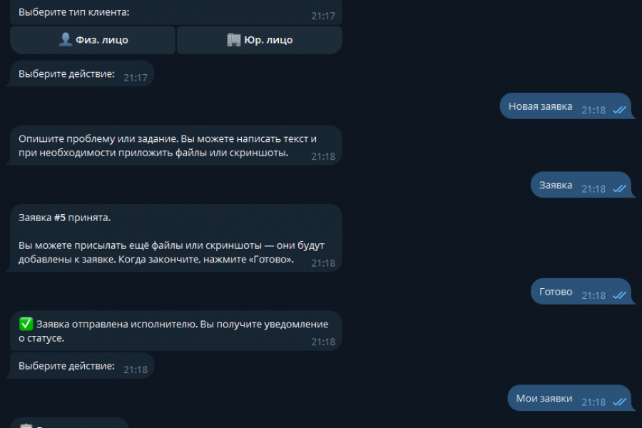 Telegram-бот “под ключ” для автоматизации общения с клиентами и приёма заявок 24/7. Бот отвечает на частые вопросы, консультирует по заданным сценариям, помогает пользователю выбрать нужный раздел и быстро собрать информацию по запросу. В ходе диалога бот запрашивает контактные данные и детали обращения, формирует заявку в структурированном виде и отправляет её ответственному сотруднику. Если вопрос нестандартный, бот переводит диалог на оператора или уведомляет менеджера.