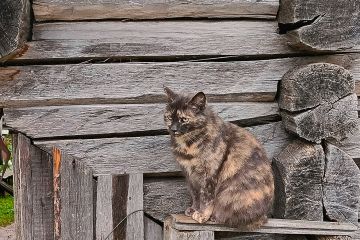 Продаю: Трехцветный кот сидит возле старого деревянного дома в российской глубинке - готовая работа на продажу :9282