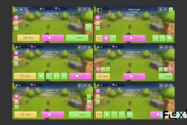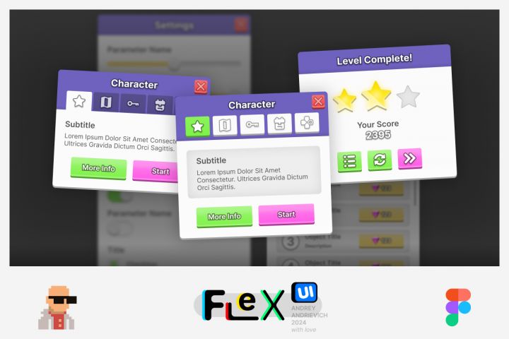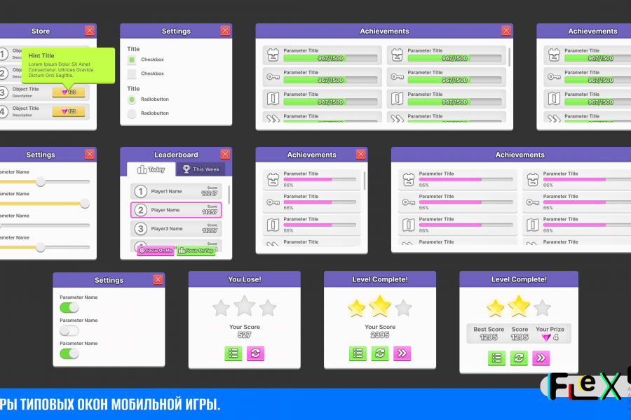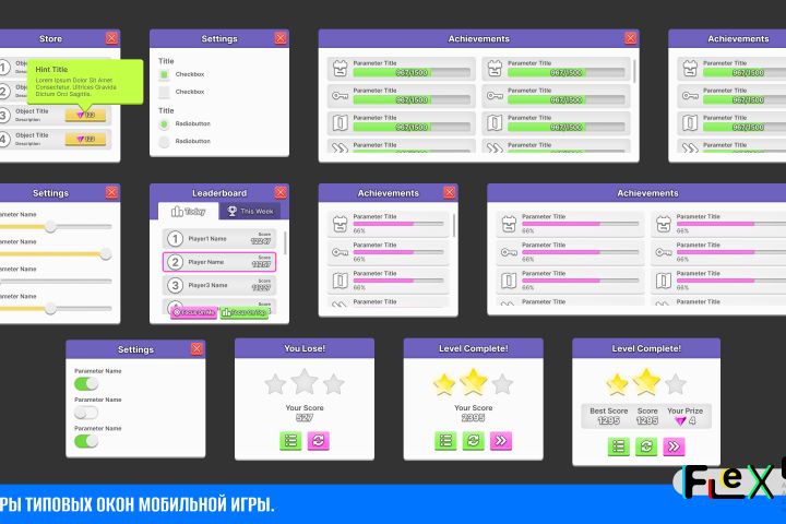 Уже готовый UI Kit (набор элементов интерфейса) для вашей игры с примерами основных окон типичной мобильной игры (БОЛЕЕ 70 примеров).