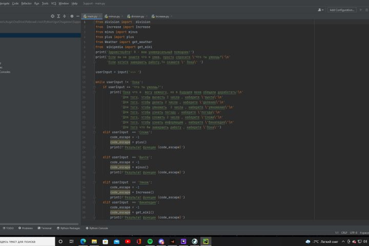 Готовый универсальный помощник, умеет самый простые математические действия, показывает погоду в данный момент.