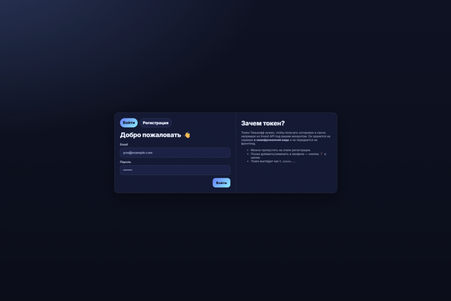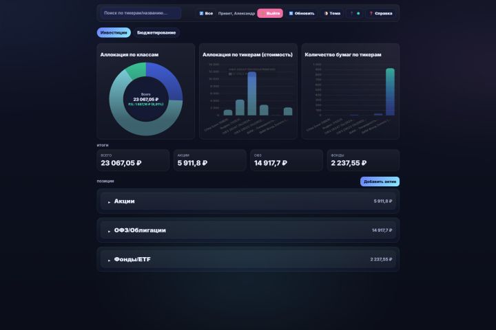 В продаже исходный код веб-приложения «Инвестиции + Бюджет». Назначение: учёт портфелей и позиций, сделки/движения средств, справочник инструментов, котировки/свечи (через Tinkoff Invest API по токену пользователя), бюджетирование: счета/категории/операции, своды и диаграммы, учёт обязательств.