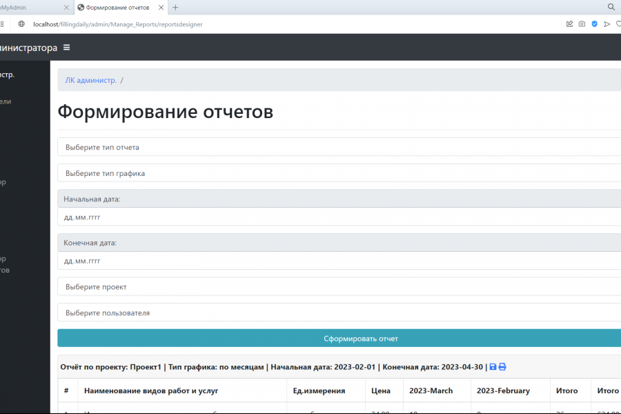 Веб сайт с доступом по логину-паролю для заполнения ежедневной отчетности по выполненным операциям, включающий доступ администратора для объединения полученных данных в сводные отчеты. Создано - запоминание пользователя и ввод капчи при неправильном вводе 3 раз логина или пароля. Пользователь заполняет отчеты каждый свой, администратор формирует отчета, также выполняет CRUD операции над пользователями проектами услугами и может изменить количество работ в услугах. В отчетах выполнен экспорт в Эксель и отправка на печать сразу.