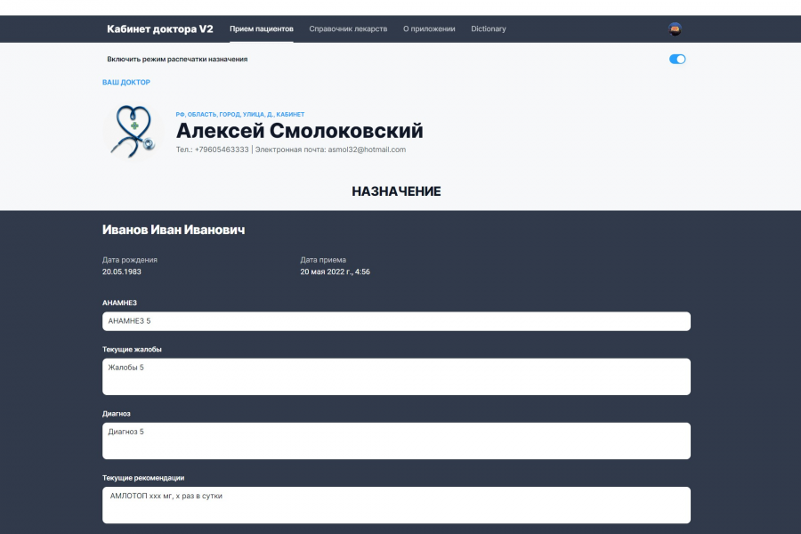 - добавлять в назначение лекарства и дозировки из встроенного каталога;