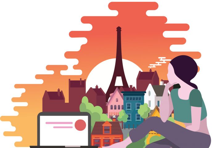 Девушка, мечтающая, наслаждающаяся прекрасной палитрой красок заходящего солнца в Париже.