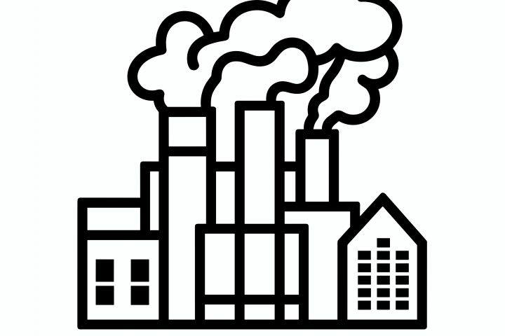 Изображение создано нейросетью. Черно-белое векторное изображение фабрики на белом фоне.