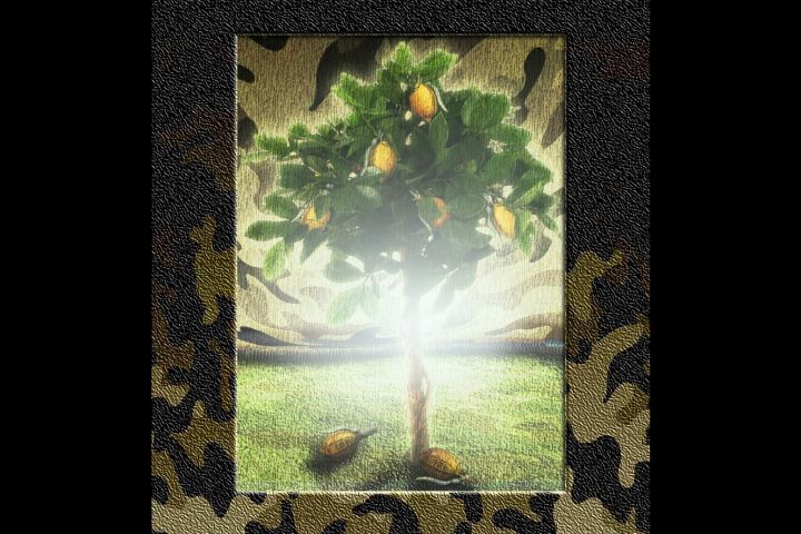 Дизайн ветрины магазина оружия "Оружейное дерево". На работе изображенно лимонное дерево с которого падают созревшие "лимонки", на фоне лес из потронов и небо в комуфляжном цвете.