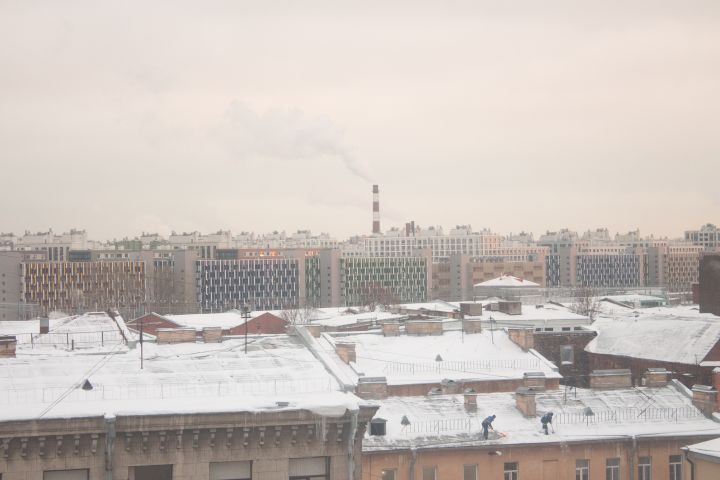 Вид на центр города Санкт-Петербурга с трубой котельной на горизонте.