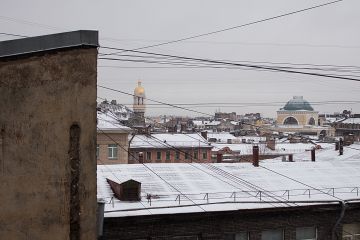Вид из окна 8 этажа на заснеженные крыши Санкт-Петербурга и колокольню Владимирского собора.