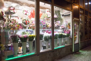Малый бизнес, небольшой цветочный магазин для вас или ваших близких, витрина цветочного магазина вечером