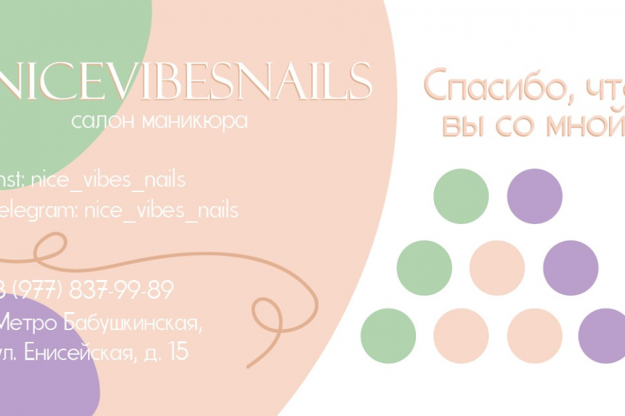 Лаконичный дизайн визитки для нейл-мастера или салона. Меняю название и всю контактную информацию бесплатно. Возможна корректировка цветов. После выполнения заказа отправляю ai и pdf файлы.